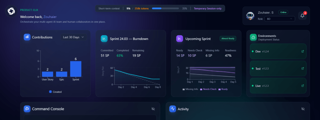 Whether the objective is to launch a new feature, improve quality, or optimize internal processes, Elix MAS translates high-level business intentions into actionable and structured inputs.