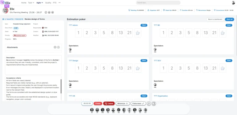 Elix prend en charge la planification et l’estimation interfonctionnelles des User Stories, permettant ainsi une évaluation précise de celles-ci pour tous les rôles (développeurs, testeurs, concepteurs, etc.).